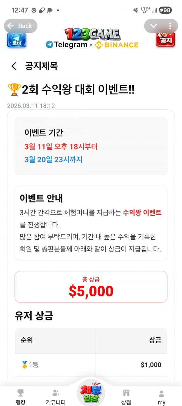 123차트게임입니다 다들 지금 이벤트 하고있어요 체험머니로 배팅만하면 돌볼어갈수있어여 ㄷㄷ 많이 이용해보셔요 3시간마다 100테드지급하고았습니다!! Kyc인증없이 이용가능하유 한번씩해보셔여ㅕ
