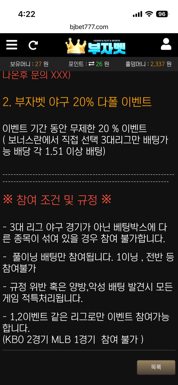 또, 야구 개막해서 무제한 매충 20% 까지 주는데 안 쓸 수가 있나? ㄷㄷ 다른데 가지말고 그냥 부자벳 오세요