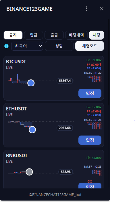 안녕하세요 123차트게임 입니다. 실이용자로써 후기한번 드릴게요 일단 입출금 원화 테더 다되고요 입출금 자동화로 거의2분내로 다 출금완료됩니다. 그리고 게임 진짜단순해서 다들 돈많이벌어가실거에요 1분뒤에 올라갈지내려갈지 선택만하면 끝입니다 다들한번 즐기러와버세여 ㅎㅎ